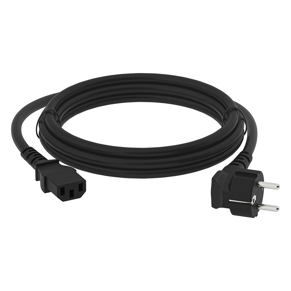 Сетевой кабель изготовлен из высококачественных материалов и представляет собой трехжильный провод с площадью сечения проводника 0,5мм2 / 0,75мм2 / 1,0мм2 / 1,5мм2, оснащенный с одной стороны неразборной литой евровилкой углового исполнения с заземляющим контактом, с другой литым трёх контактным разъёмом C13. Прочная внешняя оболочка из PVC пластика отлично защищает от внешних повреждений и перегибов, сохраняя целостность кабеля и обеспечивая продолжительный срок службы.