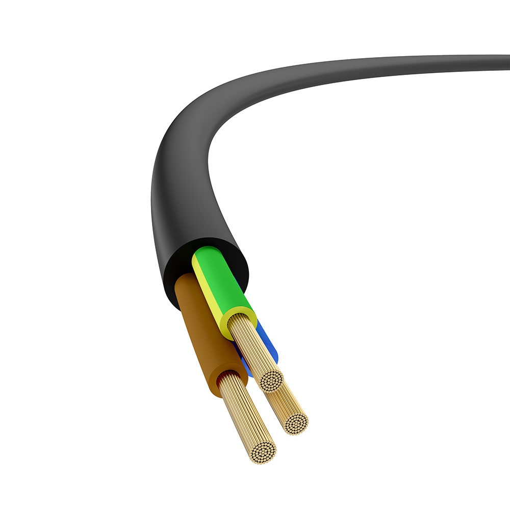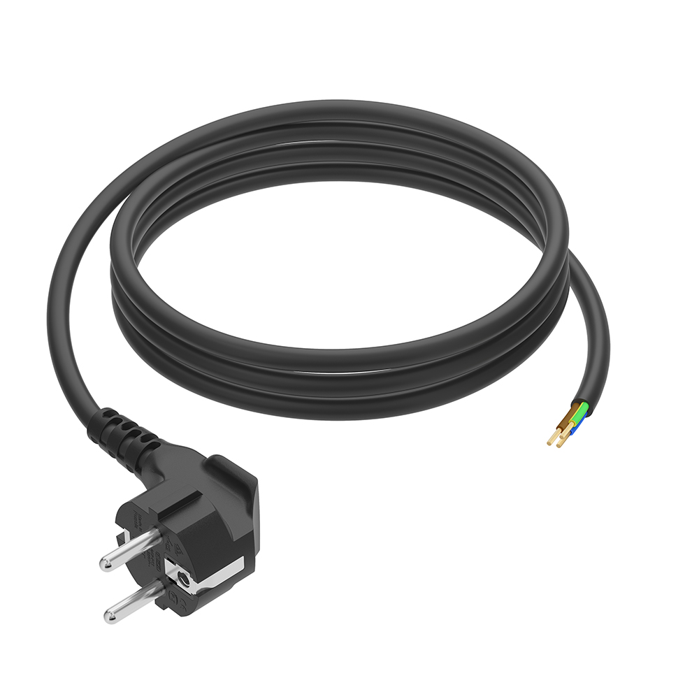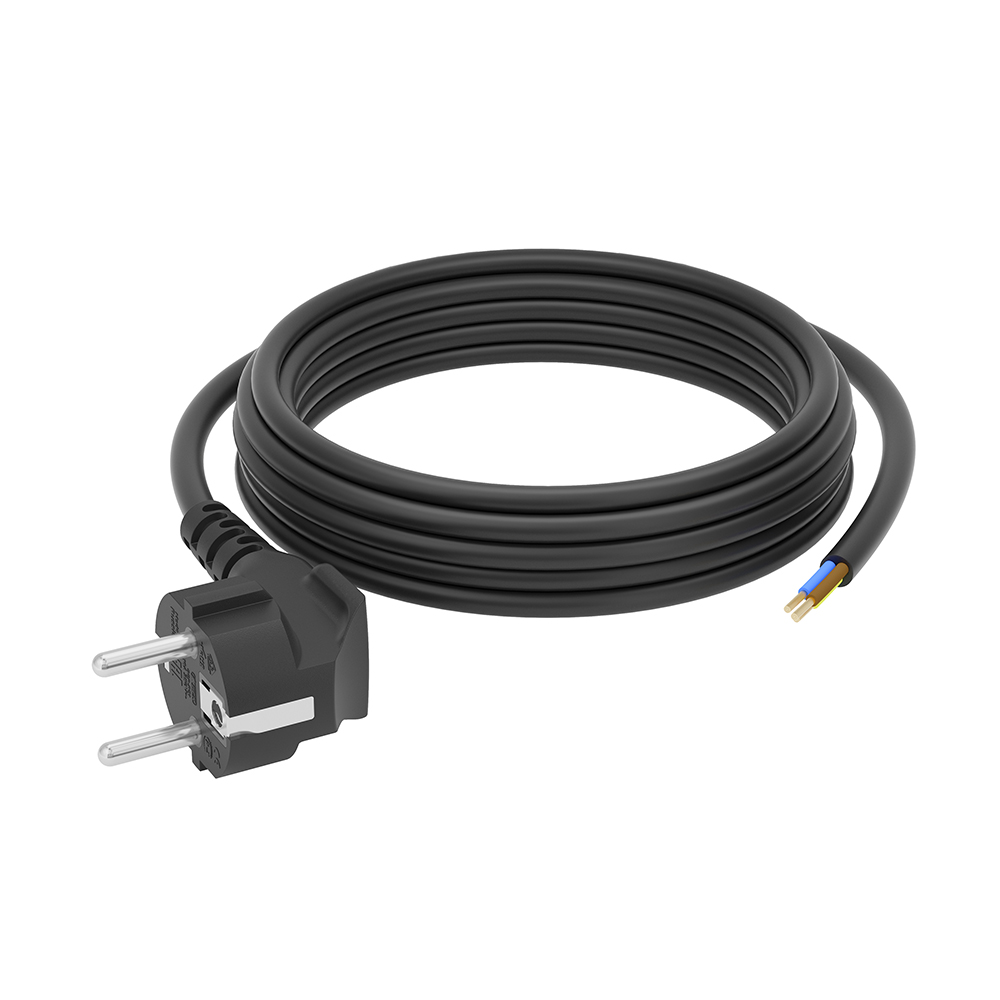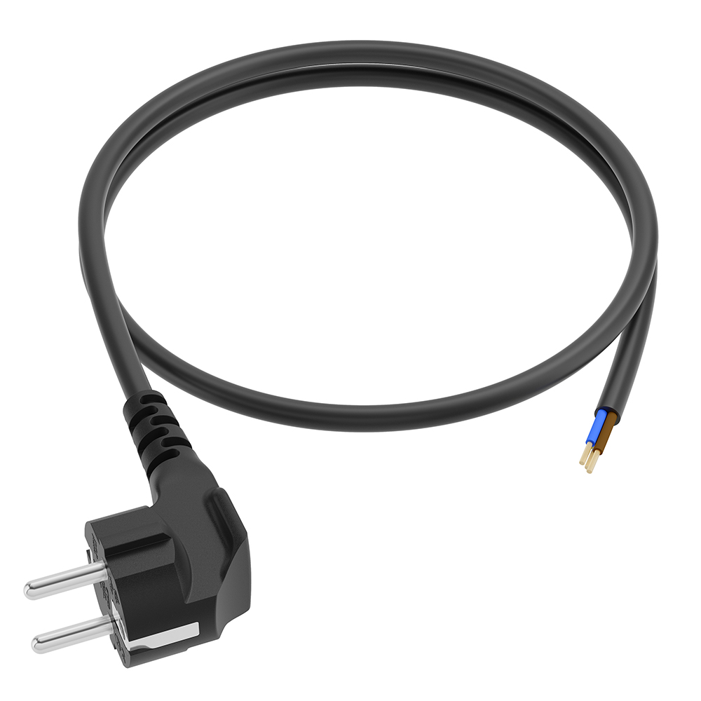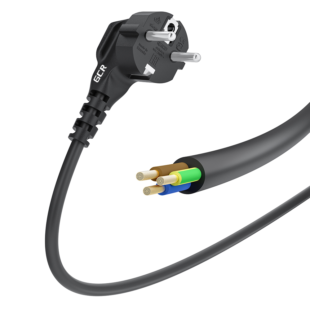 Сетевой кабель изготовлен из высококачественных материалов и представляет собой трехжильный провод с площадью сечения медного проводника 0,5мм2 / 0,75мм2 / 1,0мм2 / 1,5мм2 с неразборной литой евровилкой Schuko углового исполнения с заземляющим контактом.