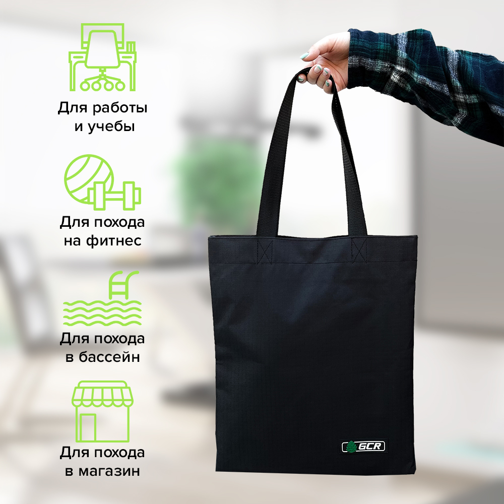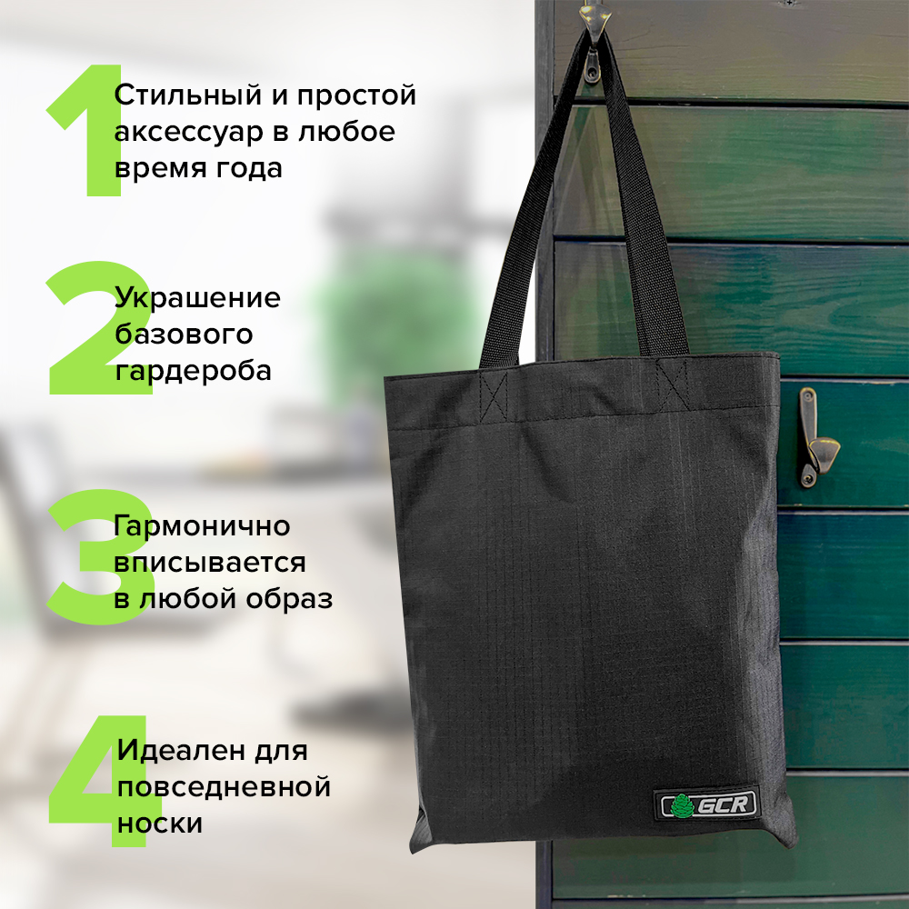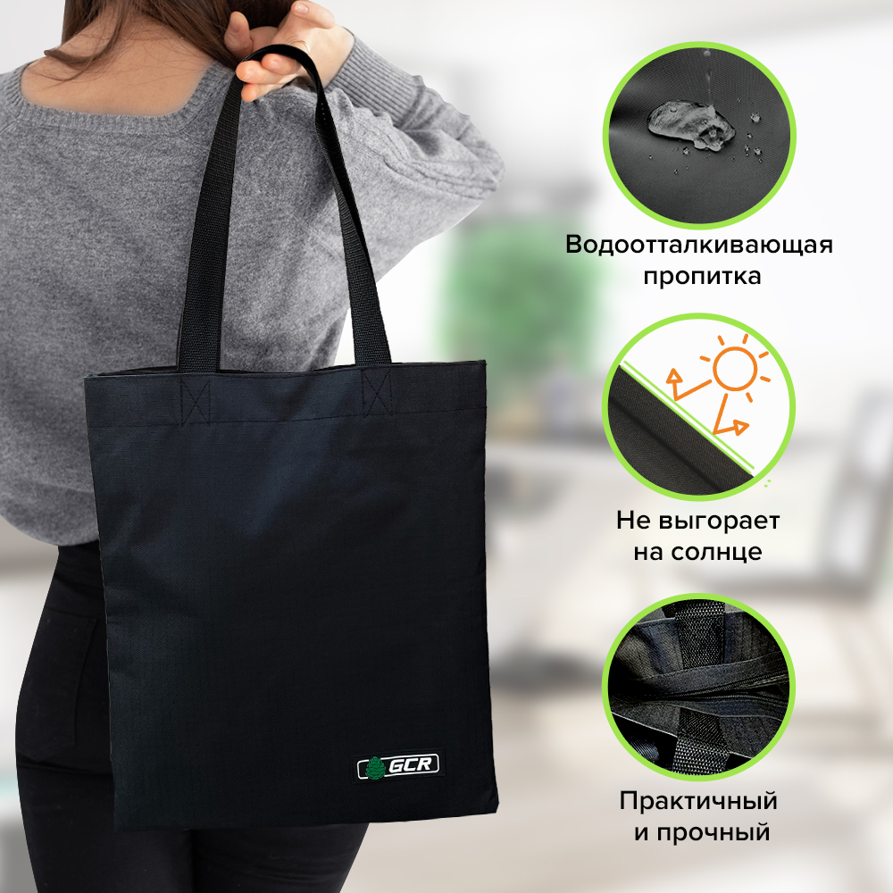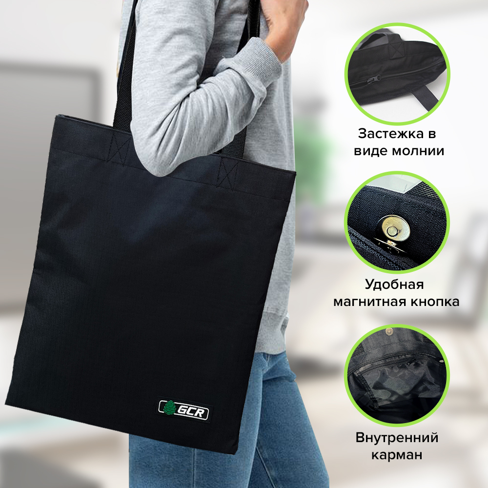 Стильная черная сумка шоппер от GCR это практичный и прочный аксессуар в любое время года. Сумка изготовлена из ткани с водоотталкивающей пропиткой, материал не выгорает на солнце, устойчив к воздействию влаги и перепадам температур. Оснащена застежкой в виде молнии и удобной магнитной кнопкой, имеет внутренний карман и длинную лямку через плечо.