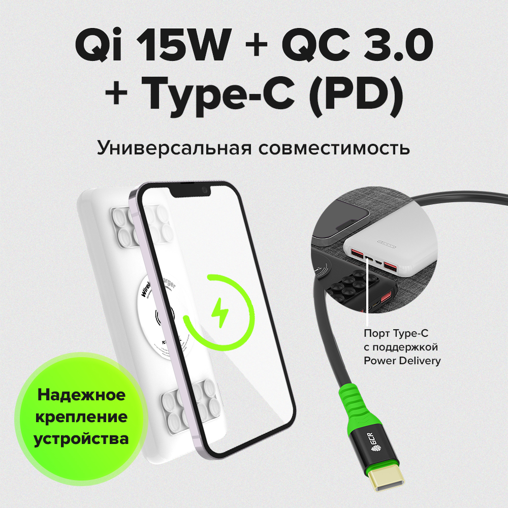 Внешний аккумулятор на 10000 mAh/20000 mAh позволяет заряжать несколько устройств одновременно, поддерживая беспроводную зарядку (Qi) с мощностью до 15W и современные стандарты быстрой зарядки: Quick Charge 3.0 и Power Delivery, благодаря разъемам USB (2 порта) и Type-C. PowerBank оснащен светодиодными индикаторами, отображающими процентную емкость заряда и рабочий статус, а благодаря надёжному креплению повербанк легко фиксируется на задней панели смартфона или планшета. Универсальность и совместимость делают его незаменимым аксессуаром для путешествий, работы и повседневной жизни.