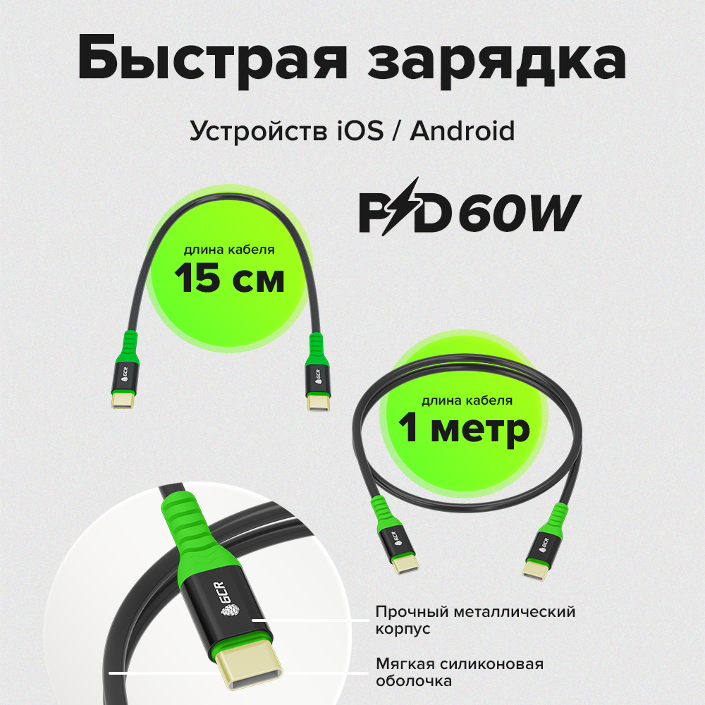Стильные кабели в комплекте Type-C M/M обеспечивают передачу данных до 480 Мбит/c и быструю зарядку с поддержкой PD до 60W современных устройств с разъемом Type-C – смартфонов iOS, Android, планшетов, GPS навигаторов, наушников и других девайсов. Изготовлены из PREMIUM материалов - медный проводник, позолоченные коннекторы, металлические корпуса, гибкая силиконовая оболочка. Идеальное решение для iPhone 15 Pro Max, 15 Pro, 15 Plus, 15, iPad, MacBook, Android и т.д.