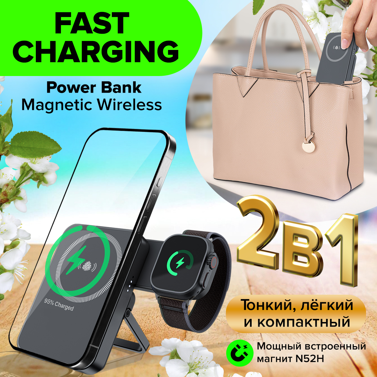 - Магнитный внешний аккумулятор 2в1